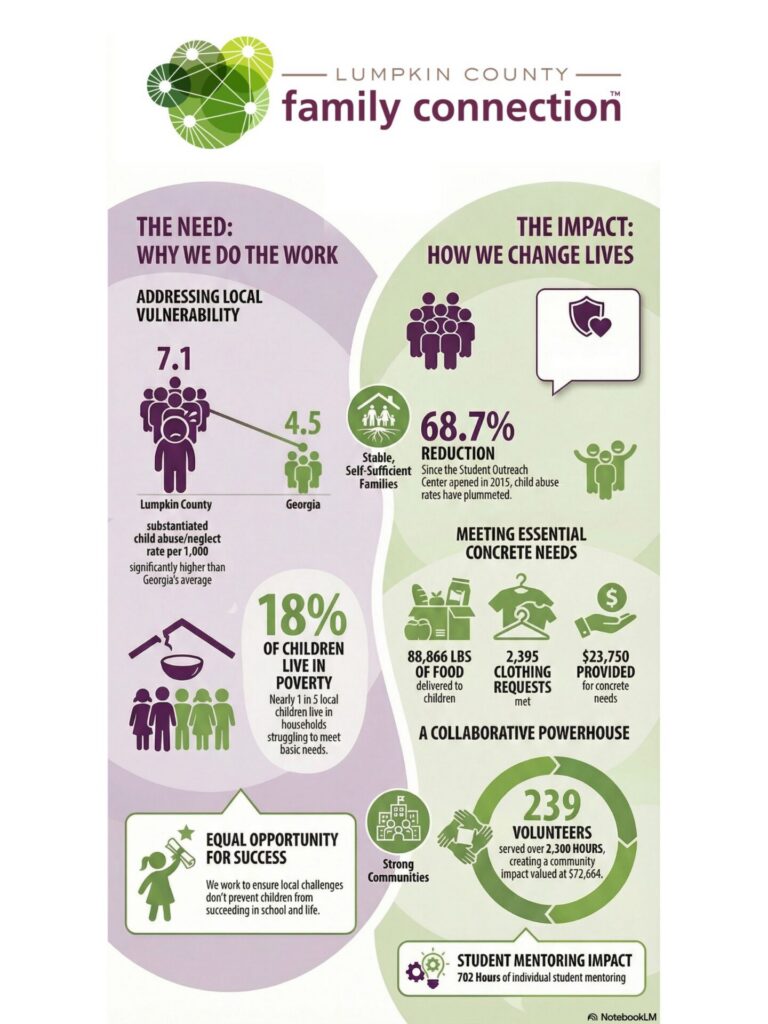 Current, reliable data helps us inform decisions about improving outcomes for the children, families, and communities we serve. As part of the Georgia Family Connection statewide network, we have access to customized information and tools specific to our Collaborative’s and partners’ needs. Data brings into focus for us an accurate picture of our community by pointing out our strengths, our weaknesses, and trends we may not have noticed before.